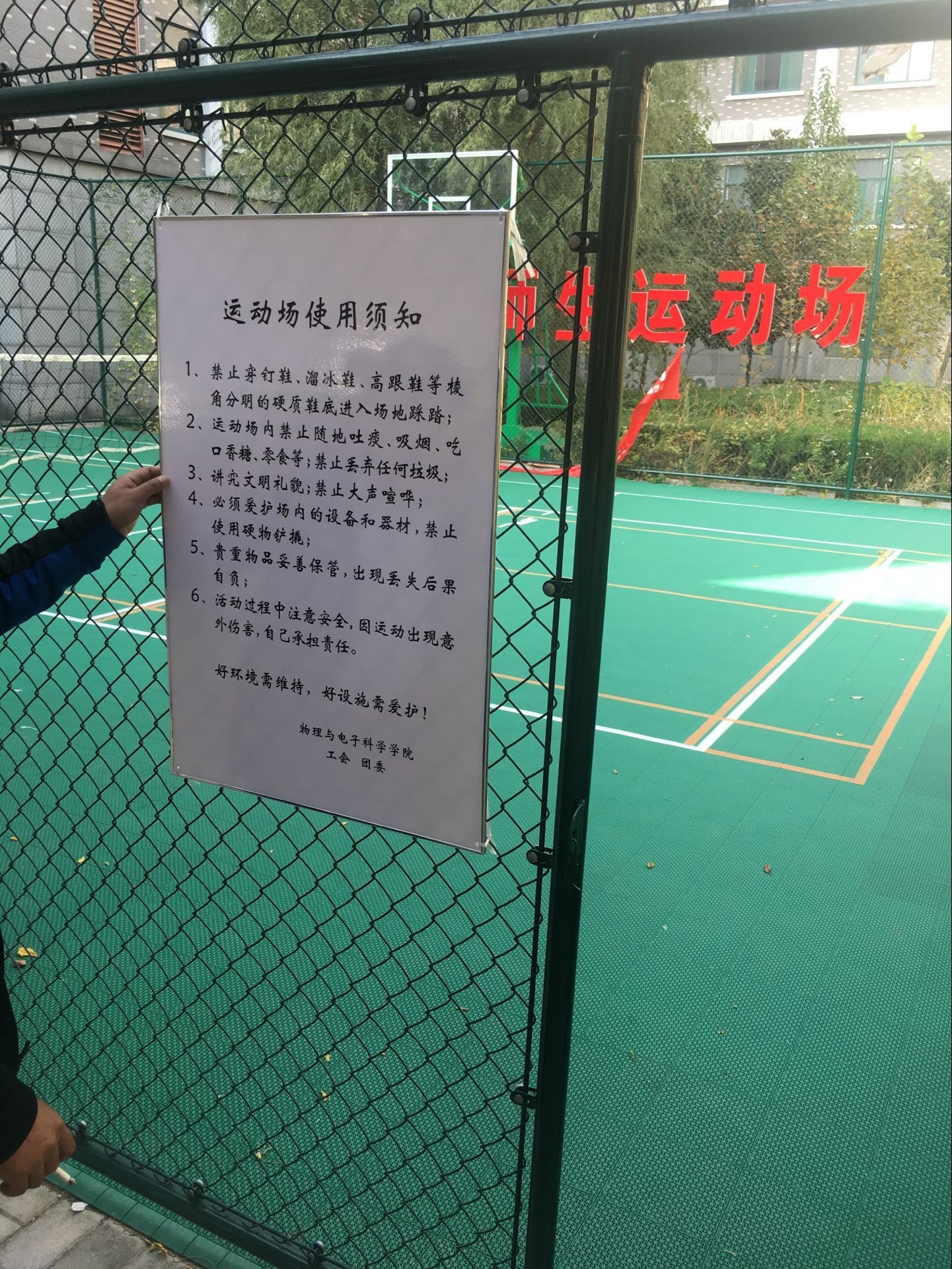 运动场使用须知 1、 禁止穿钉鞋、溜冰鞋、高跟鞋等菱角分明的硬质鞋底进入场地踩踏;2、 运动场内禁止随地吐痰、吸烟、吃口香糖、零食等;禁止丢弃任何垃圾;3、 讲究文明礼貌;禁止大声喧哗;4、 必须爱护馆内的设备和器材,禁止使用硬物铲撬;5、 贵重物品妥善保管,出现丢失后果自负;6、 活动过程中注意安全,因运动出现意外伤害,自己承担...