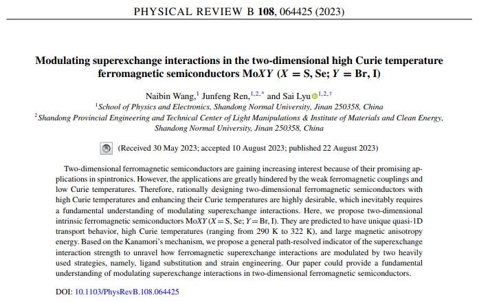 近日,任俊峰教授团队吕赛博士在凝聚态物理领域国际顶级期刊《Physical Review B》上发表了题为“Modulating superexchange interactions in the two-dimensional high Curie temperature ferromagnetic semiconductors MoXY (X = S, Se; Y = Br, I)”的学术论文。365上市公司是论文唯一完成单位,王乃斌硕士研究生为第一作者,任俊峰教授和吕赛博士为通讯作者。