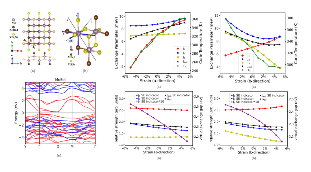 二维铁磁半导体在自旋电子器件中有着广泛的应用前景,但是普遍较低的居里温度是限制其应用的因素之一。居里温度与电子自旋间的磁耦合强度密切相关,对于超交换作用的调控机理研究有助于提升二维铁磁半导体的居里温度。作者预测了一种新型的具有室温居里温度的二维铁磁材料MoXY (X = S, Se; Y = Br, I),同时基于Kanamori的磁交换机制,提出了一种普适性的超交换作用强度的描述符,借助该描述符,作者揭示了应变和配体如何调控超交换作用的强度。该工作可以为调控自旋间超交换作用的强度提供新的思路与方向。