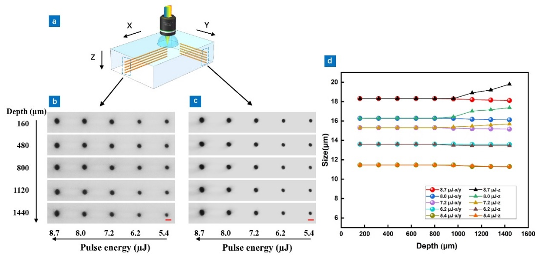 传统的飞秒激光直写加工技术存在横向和轴向加工分辨率不对称的问题,此外在透明材料中同时实现高效率和三维各向同性加工仍然是一个挑战。作者提出了一种基于高重复率飞秒激光脉冲的时空聚焦方案,通过在高重频飞秒激光器外搭建展宽器而后通过单通压缩器进行脉冲压缩的方式,在物镜焦点处实现了不同频谱成分时间和空间的同时聚焦,克服了传统飞秒激光加工横纵分辨率不对称的问题,在透明材料内部可实现高效、加工分辨率可连续调节的三维各向同性加工。该研究在微流体芯片以及光子芯片制造、激光3D打印等领域具有重要的应用前景。