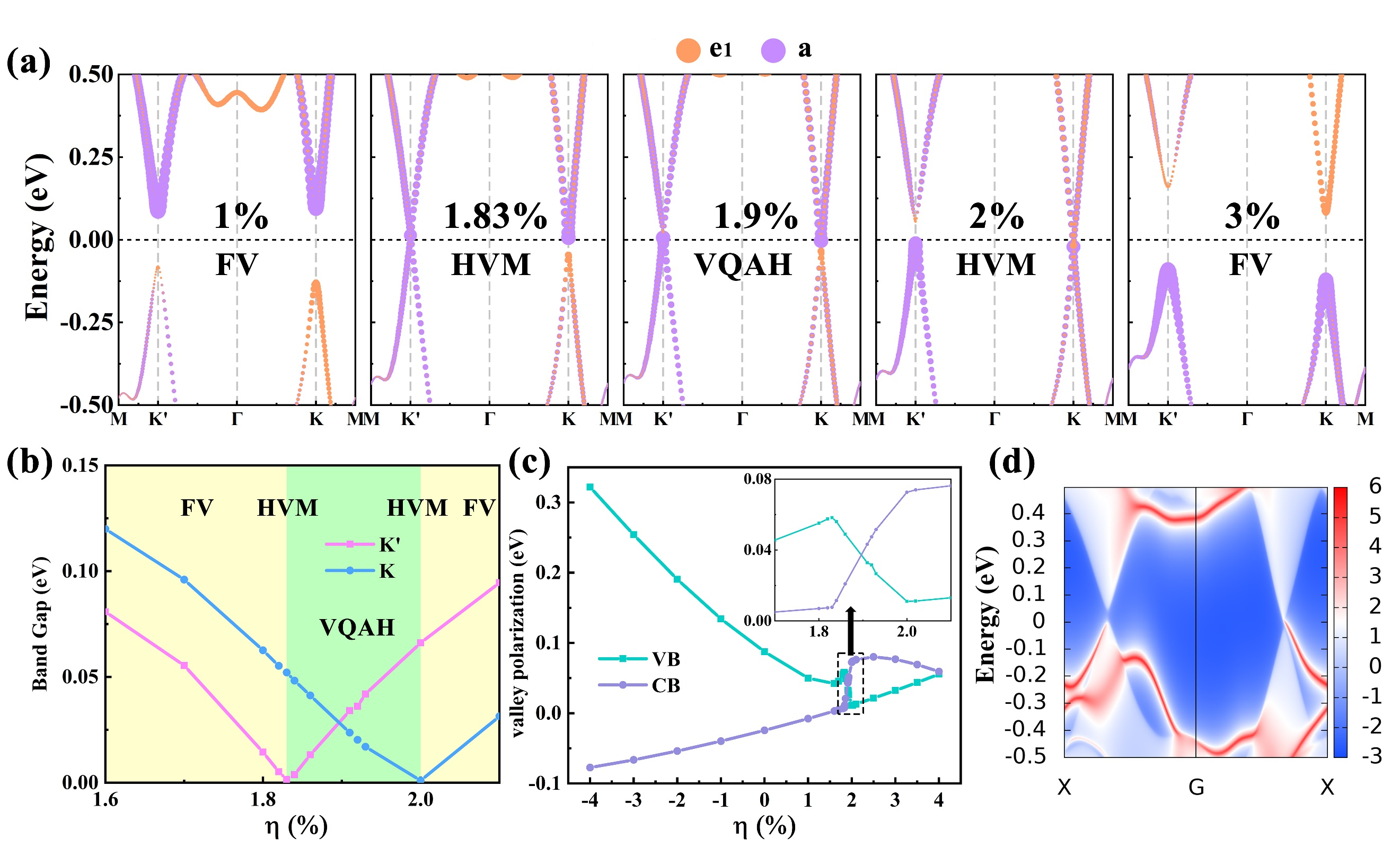 谷电子学和拓扑学的研究一直是凝聚态物理的研究热点。在同一种二维材料中实现二者性质的结合具有重要的研究价值。作者预测了一种二维铁磁材料OsClBr,其不仅具有87.5 meV 的自发能谷极化,还具有双极半导体的特征。此外,通过施加拉伸应变可以在OsClBr种诱导产生铁谷(FV)到半谷金属(HVM)再到谷极化量子反常霍尔(VQAH)相的拓扑相变。同时,双层OsClBr具有堆叠依赖的拓扑性质,通过层间滑移可以实现拓扑平凡与非平凡的相变。有趣的是,某些堆叠结构是本征的拓扑绝缘体,其VQAH相在宽应变范围内具有鲁棒性。这项工作不仅为谷电子学与拓扑学的研究提供了新的平台,还为低功耗电子器件的制备和应用提供了潜在的机会。