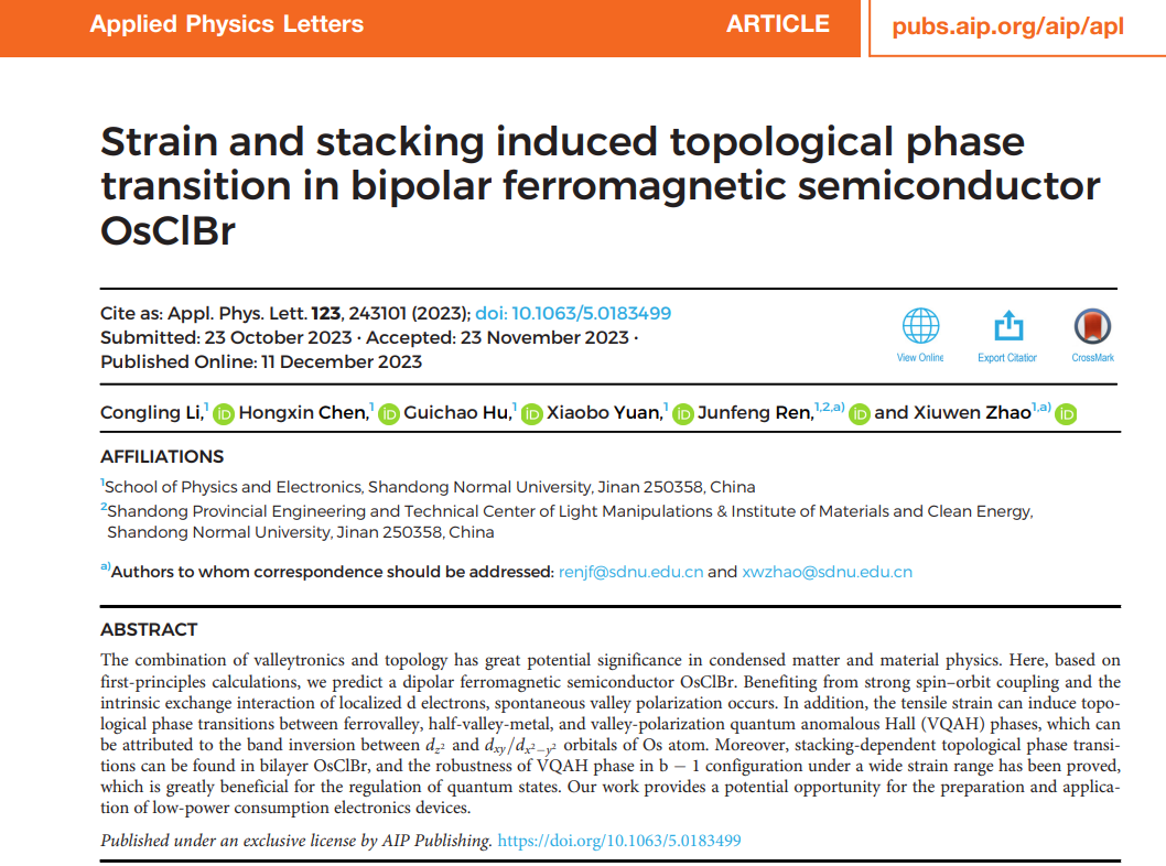 近日,任俊峰教授团队在应用物理领域国际顶级期刊《Applied Physics Letters》上发表了题为“Strain and stacking induced topological phase transition in bipolar ferromagnetic semiconductor OsClBr”的学术论文。365上市公司为唯一论文署名单位,硕士研究生李聪玲为第一作者,任俊峰教授和赵秀雯博士为通讯作者。
