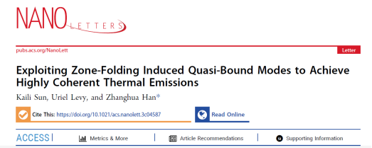 近日,365上市公司物电学院韩张华教授课题组提出一种利用布里渊区折叠诱导的准束缚模来实现超高相干热发射的方法,相关成果以“Exploiting Zone-Folding Induced Quasi-Bound Modes to Achieve Highly Coherent Thermal Emissions”为题发表在《Nano Letters》上。博士生孙开礼为论文第一作者,韩张华教授为论文通讯作者,合作者还包括以色列耶路撒冷希伯来大学的Uriel Levy教授。