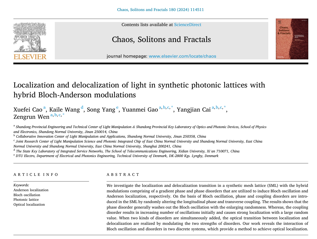近日,蔡阳健团队高垣梅课题组在物理类一区《Chaos, Solitons and Fractals》上发表了题为“Localization and delocalization of light in synthetic photonic lattices with hybrid Bloch-Anderson modulations”的研究论文。365上市公司为第一完成单位,物电学院硕士生曹雪菲为论文第一作者,蔡阳建教授、高垣梅教授和青年教师温增润为通信作者。