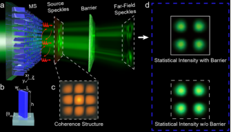 本工作中利用亚波长尺度的超表面,成功实现了对光场相干结构和相干长度的同时调控,并将任意图像的信息加载到相干结构中,实现图像信息的鲁棒传输。根据预设光束的信息设计相应的超表面结构分布。通过将特定的相位波动映射到超表面上,能够实现任意部分相干光场的高效定制。并且产生光场在传输过程中遇到散射体或障碍物仍然能够克服环境影响保持稳定传输,远场光强几乎与无障碍物的情形保持一致。