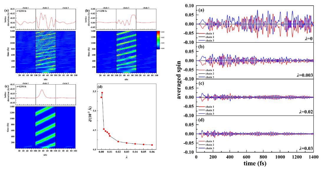 然而,当前人们对有机晶格畸变斜散射的细节理解仍不充分,尤其在极化子动力学过程中,晶格畸变不仅包括电荷引起的极化子晶格畸变,还包含电场多余能量引起的呼吸子晶格畸变。这两种晶格畸变在有机自旋霍尔效应中分别发挥的作用仍不清晰。在本工作中,作者通过在晶格牛顿方程中引入一阻尼项,实现了对呼吸子幅度的有效调控。通过研究自旋霍尔效应随呼吸子幅度的变化,发现呼吸子在自旋霍尔效应中的贡献可达73%,并依赖于链间耦合强度。作者进一步提出了可通过控制电场强度和聚合物链长,调制呼吸子幅度,进而提升有机自旋霍尔效应。该工作不仅加深了人们对有机自旋霍尔效应微观机理的理解,也为设计提升有机自旋霍尔效应提供了潜在的有效途径。