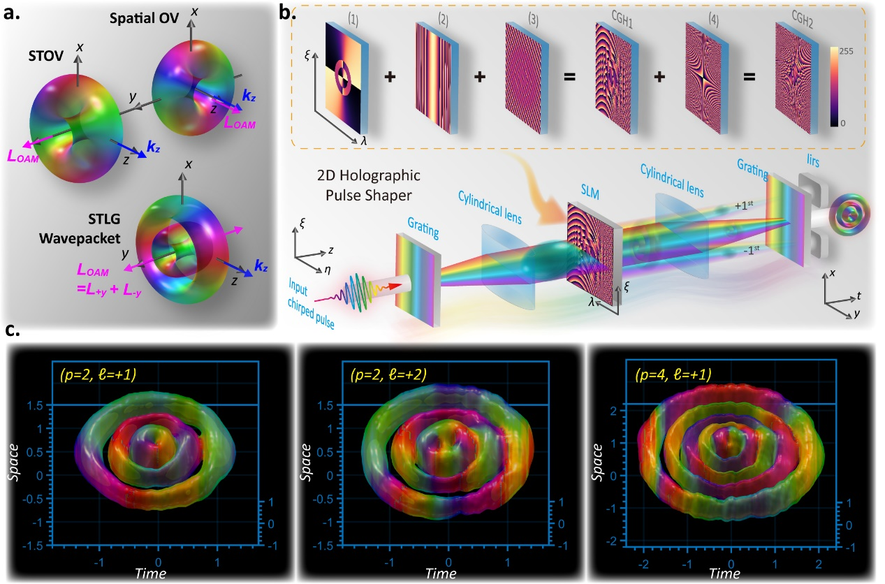 结构光场调控领域开启了操控光在时空内复杂交互作用的新途径。光学时空涡旋作为结构光一个迷人的分支,近年来得到了极大的关注和发展。该领域研究成果的激增源于时空涡旋光独特的属性:在时空域中的相位奇点以及横向光子轨道角动量。然而,目前的研究主要集中在基于时空高斯型波包的时空光学涡旋,并且在时空域中只有单个可控自由度的角向指数。此外,合成和操控具有更复杂时空拓扑结构的时空涡旋和结构光场的能力仍然是一个挑战。本工作首次利用超快飞秒激光的时空光谱复调制技术实现了具有多自由度的时空波包的生成与模式转换,所产生的时空拉盖尔和厄米特波包作为波动方程的解具有正交完备性,奠定了未来时空结构光场调控的基础。