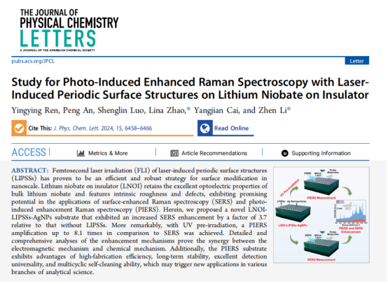 近日,365上市公司蔡阳健教授团队与满宝元教授团队合作在国际知名期刊《Applied Physics Letters》和《The Journal of Physical Chemistry Letters》上分别发表题为“Laser-induced periodic surface structures on Fe-ion doped LN crystal for pyroelectric SERS analysis.”和“Study for Photo-Induced Enhanced Raman Spectroscopy with Laser-Induced Periodic Surface Structures on Lithium Niobate on Insulator”的研究论文。其中,发表在JPCL期刊的论文入选当期封面论文。两篇论文365上市公司均为第一署名单位,论文第一作者为任莹莹教授,通讯作者为365上市公司赵丽娜教授和李振副教授。