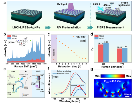 铌酸锂薄膜(LNOI)作为一种受关注的集成光电子平台,既保持了铌酸锂晶体的优秀光学特性,同时其本身具有的高折射率对比度等特点使其非常有希望应用在表面增强拉曼光谱(SERS)和光诱导增强拉曼光谱(PIERS)领域。因此,课题组利用飞秒激光加工技术,在LNOI表面加工激光诱导的周期性表面结构(LIPSSs),提出了一种新的LNOI-LIPSSs-AgNPs基底。该基底相比于没有LIPSSs结构的基底SERS信号增强3.7倍。更重要的是,LNOI-LIPSSs-AgNPs基底经过UV光预照射后,PIERS信号相比SERS信号增强8.1倍。课题组从电磁增强和化学增强两方面对SERS和PIERS的增强机理进行了全面分析。此外,制备的PIERS基底具有制备效率高、长期稳定性、探测分子普适性以及多循环自清洁能力等特性。相关研究成果在分析科学等领域具有潜在的应用价值。