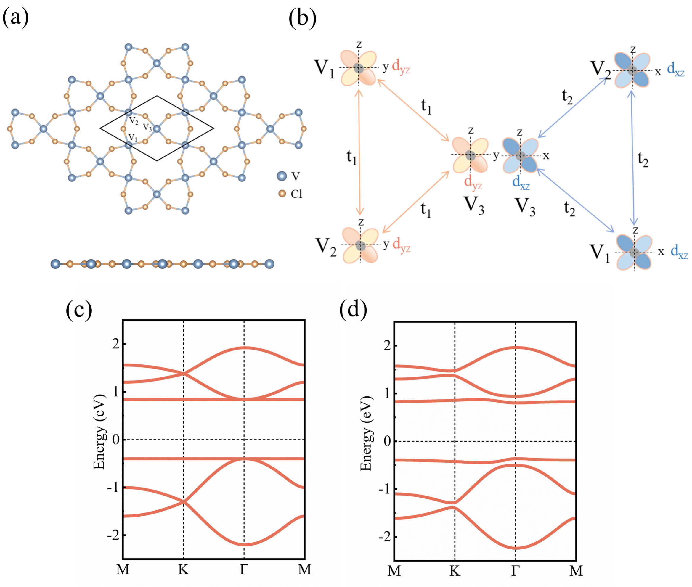 图1.(a) 单层V3Cl6的晶格结构示意图。(b) 单层 V3Cl6 中dxz轨道和dyz轨道在三个 V 原之间跃迁示意图。(c) 不考虑自旋轨道耦合下基于TB模型的阴阳kagome能带结构。(d)考虑自旋轨道耦合下基于TB模型的阴阳kagome能带结构。