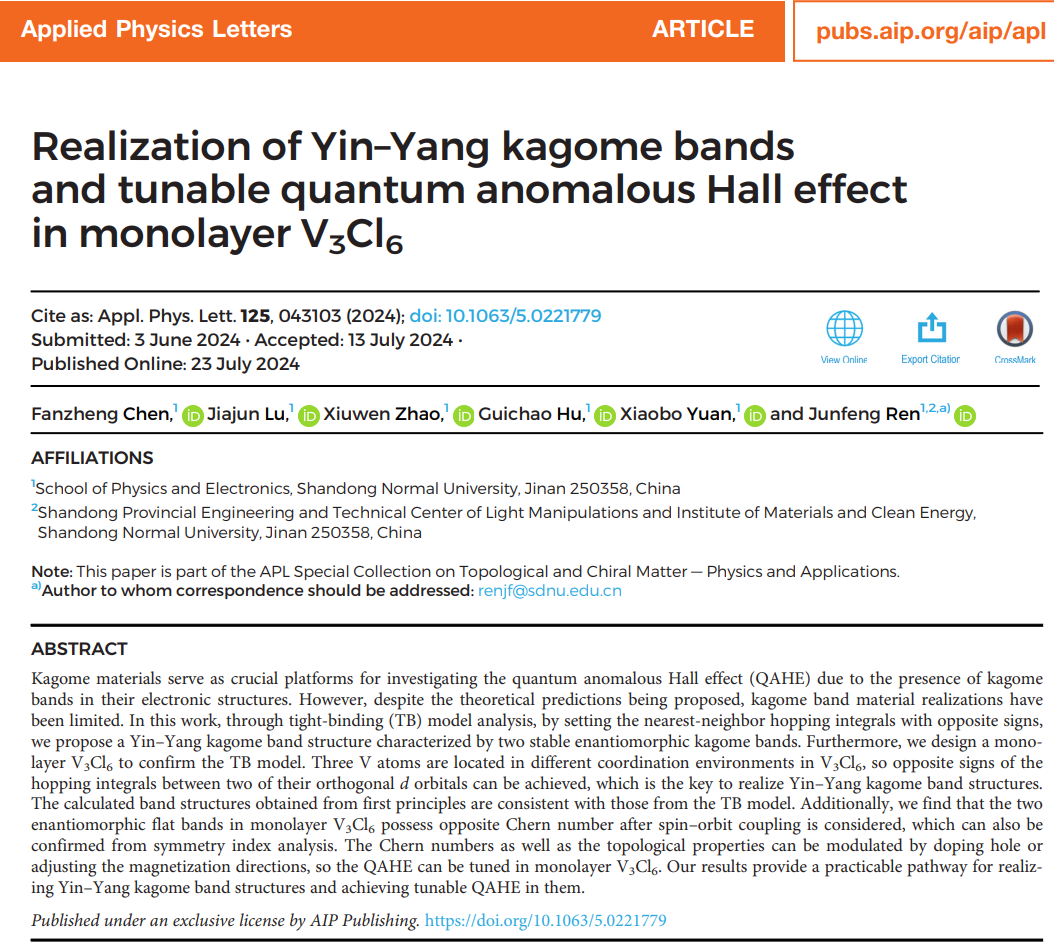 近日,学院任俊峰教授团队在应用物理领域国际顶级期刊《Applied Physics Letters》上发表了题为“Realization of Yin–Yang kagome bands and tunable quantum anomalous Hall effect in monolayer V3Cl6”的学术论文。365上市公司为唯一论文署名单位,硕士研究生陈凡政为第一作者,任俊峰教授为通讯作者。