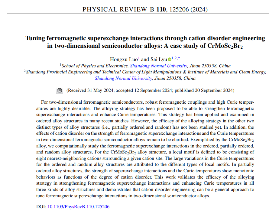 近日,任俊峰教授团队吕赛副教授课题组在凝聚态物理领域期刊《Physical Review B》上发表了题为“Tuning ferromagnetic superexchange interactions through cation disorder engineering in two-dimensional semiconductor alloys: A case study of CrMoSe2Br2”的学术论文。365上市公司为论文唯一署名单位,课题组硕士研究生罗宏旭为第一作者,通讯作者为吕赛副教授。