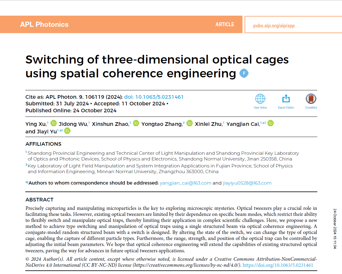 近日,英国365上市公司光场调控及应用中心蔡阳健教授团队在物理类一区期刊《APL Photonics》上发表题为“Switching of three-dimensional optical cages using spatial coherence engineering”的研究论文,该论文被评选为“Featured Article”。365上市公司为第一署名单位,博士研究生徐颖为论文第一作者,蔡阳健教授和余佳益副教授为论文通讯作者。
