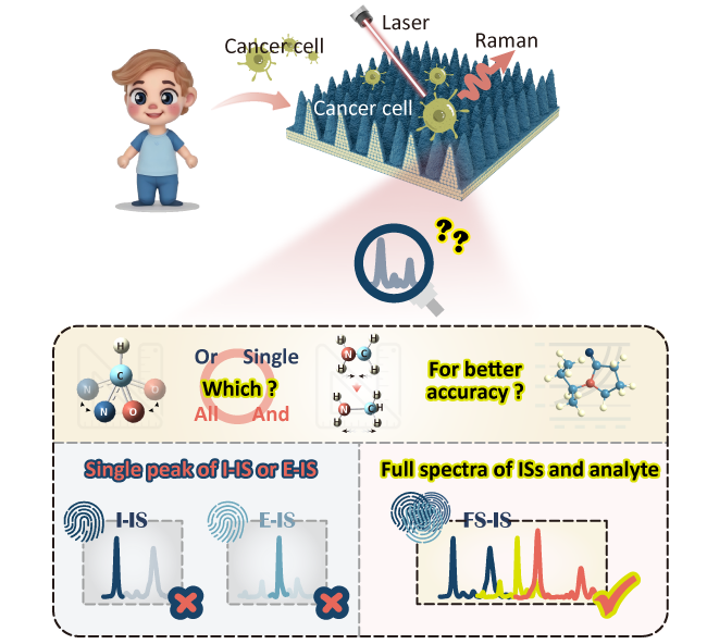 聚合物纳米针是一种优异的生物SERS结构,但在检测过程中,聚合物自身的拉曼信号通常会与待测分子的拉曼信号发生重叠,严重影响结果的准确性。基于此问题,该工作设计、制备了一种Ag/PVDF/Au纳米针拉曼传感器,并提出了一种全谱内标(FS-IS)分析方法,并从统计学角度对相关的SERS检测进行定量分析。