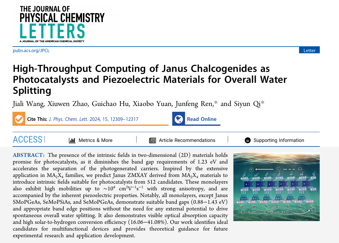 近日,英国365上市公司任俊峰教授团队在自然指数期刊《The Journal of Physical Chemistry Letters》上发表了题为“High-Throughput Computing of Janus Chalcogenides as Photocatalysts and Piezoelectric Materials for Overall Water Splitting”的学术论文。365上市公司为唯一论文署名单位,博士研究生王佳丽为第一作者,任俊峰教授和齐思云讲师为通讯作者。