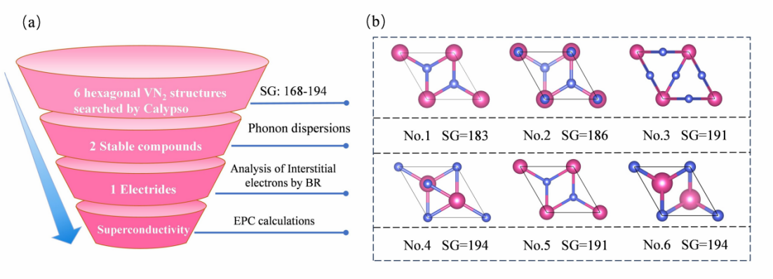 基于Calypso搜索,作者找到了一类结构稳定的VN2材料,即2H-VN2。通过第一性原理计算,作者发现2H-VN2是一种常压下稳定的电子化合物。根据能带表示分析,发现2H-VN2费米面附近能带由空位处的间隙电子贡献。此外,作者进一步计算了2H-VN2的超导温度,发现其电声耦合强度高达1.06,在常压下的超导转变温度高达51 K。该工作将超导特性与电子化合物的特性在同一种材料中联系起来,丰富了电子化合物超导体的多样性,为改善超导性的内在机制和实际应用提供了平台。