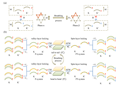 不同的二维材料表现出不同的铁电性、磁性和谷特性,而双层材料恰好具有将不同的性质进行耦合的优势,因此如何在特定的双层中实现对以上三种性质的同时耦合和操纵是一个挑战。作者基于有效的k·p模型,提出了一种在呼吸Kagome(BK)材料中实现铁电-磁-谷耦合的特殊机制。两种反铁电态之间的切换可以通过呼吸过程来实现,与此同时伴随着磁相变的产生,最终系统的谷物理特征也可以实现有效调控,这克服了通过外部磁场进行调控的困难。此外,作者还预测了一种BK材料W3Br8,通过第一原理计算,证明了W3Br8单层具有大谷极化而双层可以实现上述耦合机制,并能诱导出不同类型的层锁谷霍尔效应。这项工作不仅提供了一种新型谷电子材料候选,同时也为控制和操纵多层材料中的自旋、谷和层自由度提供了一种新的思路。