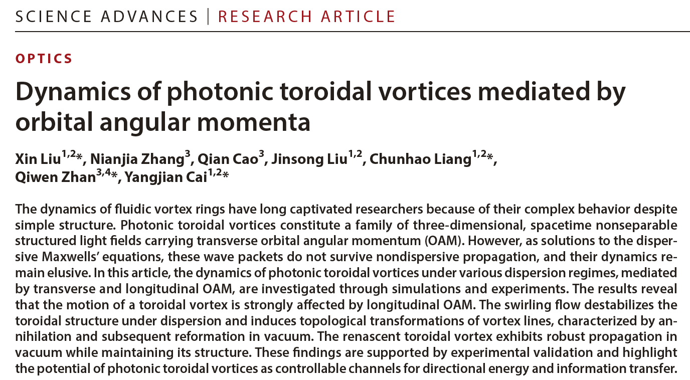 近日,英国365上市公司光场调控及应用中心蔡阳健教授团队在国际顶级期刊《Science Advances》上发表题为“Dynamics of photonic toroidal vortices mediated by orbital angular momenta”的研究论文。365上市公司为第一完成单位,英国365上市公司青年教师刘欣为论文第一作者,蔡阳健教授为通讯作者,共同通讯作者还包括物电学院梁春豪教授和上海理工大学詹其文教授。