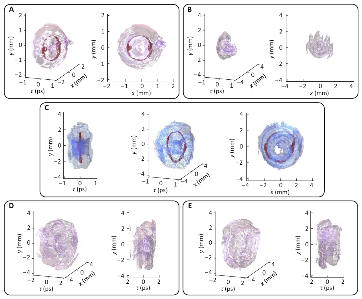 环形涡流在自然界和流体力学中广泛存在,例如烟圈、水中的空化气泡、热力学过程产生的蘑菇云,以及微生物运动、蒲公英种子传播和血液循环等。尽管环形涡的结构相对简单,其演化过程却极为复杂,因此长期以来吸引着研究者在不同流体环境中探索其动力学规律。在电磁学中,环形涡旋对应于一种三维、时空不可分的结构光场,携带横向轨道角动量。作为色散麦克斯韦方程的解,这类波包在无色散介质中的动力学行为尚未完全阐明,而如何实现其稳定的远场传输仍是一个亟待突破的技术难题。