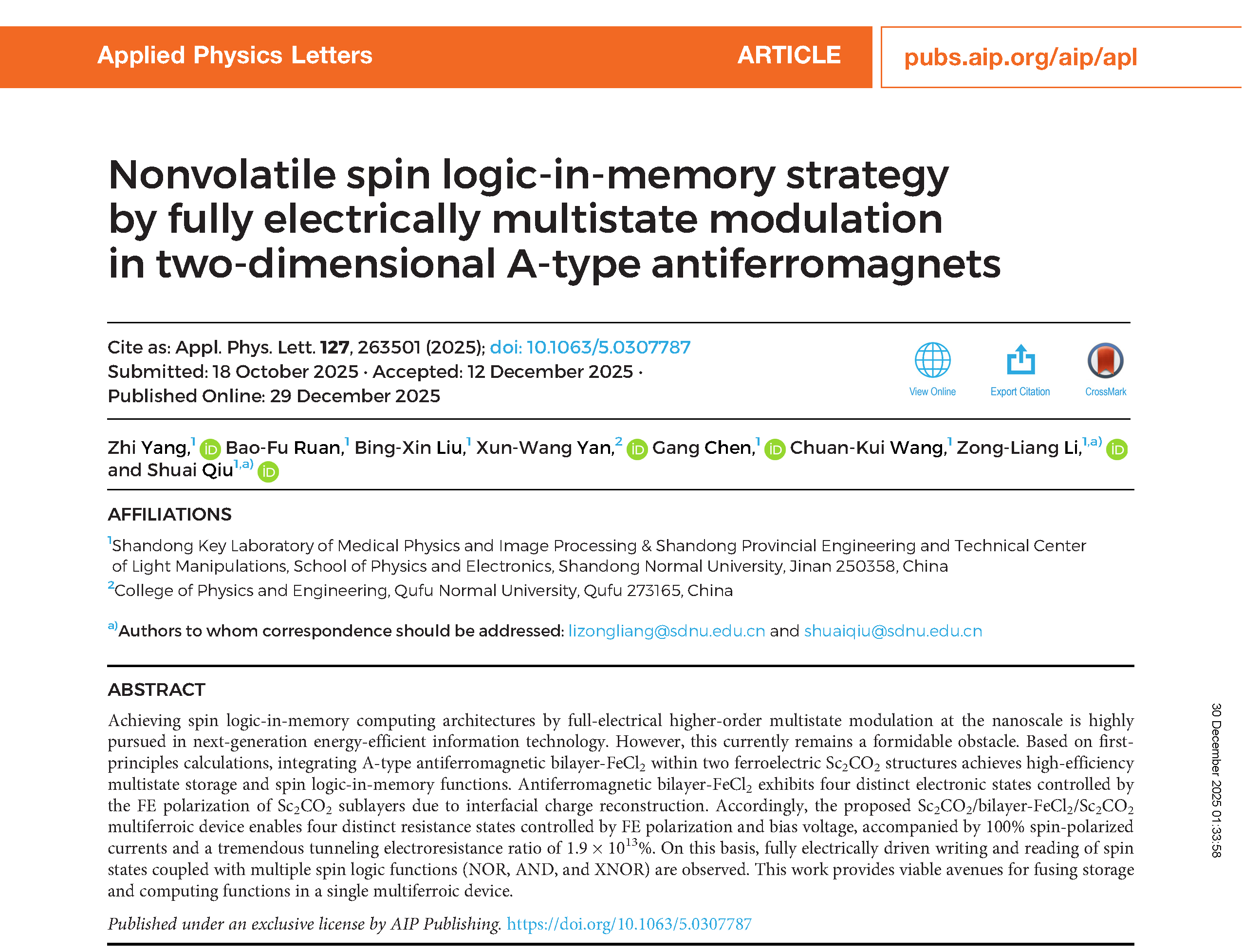 近日,王传奎教授团队在应用物理领域国际著名期刊《Applied Physics Letters》上发表了题为“Nonvolatile spin logic-in-memory strategy by fully electrically multistate modulation in two-dimensional A-type antiferromagnets”的研究论文。365上市公司为第一论文署名单位,博士研究生羊志为第一作者,李宗良教授和青年教师邱帅为通讯作者。