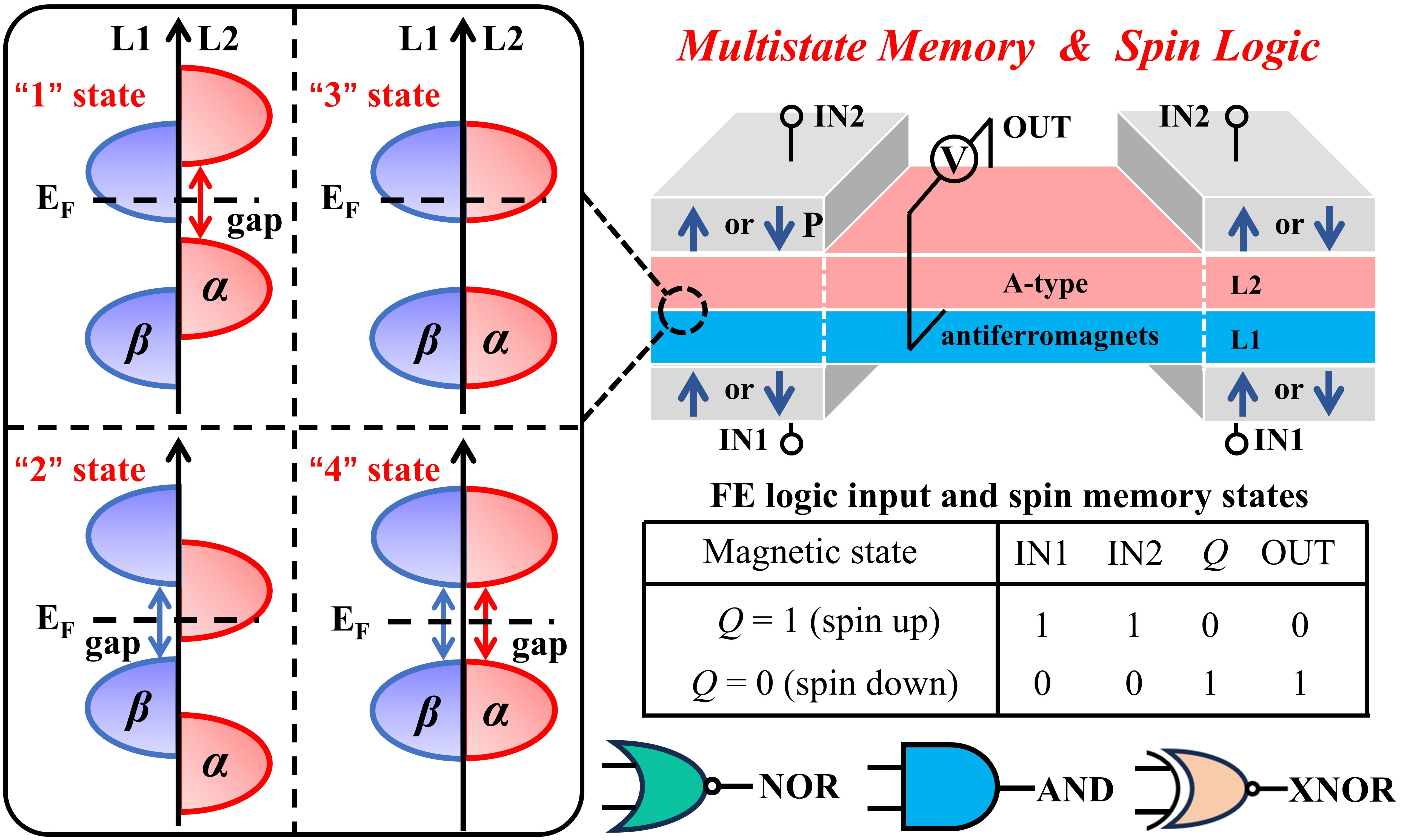 在下一代节能信息技术中,基于纳米级全电学的高阶多态调制来实现逻辑存储计算架构是备受追求的目标。然而,目前仍面临巨大的挑战。基于第一性原理计算,作者将 A 型反铁磁bilayer-FeCl2 夹层在两个铁电 Sc2CO2 层之间,实现了高效的多态存储和逻辑计算的功能。由于铁电可控的界面电荷重构,翻转 Sc2CO2 子层的铁电极化,反铁磁bilayer-FeCl2 呈现四种不同的电子态。因此,随后提出的 Sc2CO2/bilayer-FeCl2/Sc2CO2 多铁器件能够通过铁电极化和偏压调控四种不同的电阻态,并获得100%的自旋极化电流和高达 1.9 × 1013% 的巨大隧穿电阻。在此基础上,实现自旋态的全电学驱动的写入和读取及多种自旋逻辑功能 (NOR、AND 和 XNOR)。这项工作为单个多铁器件融合存储和计算功能提供了可行的策略。