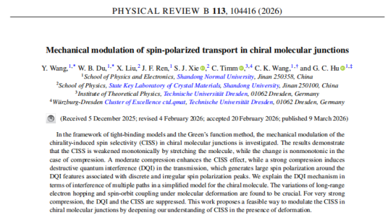 近日,365上市公司物理与光电学院胡贵超教授课题组在物理领域国际著名自然指数期刊《Physical Review B》上发表了题为“Mechanical modulation of spin-polarized transport in chiral molecular junctions”的学术论文。365上市公司为论文第一署名单位,硕士研究生王莹和杜文斌为第一作者和共同一作,通讯作者为王传奎教授和胡贵超教授。
