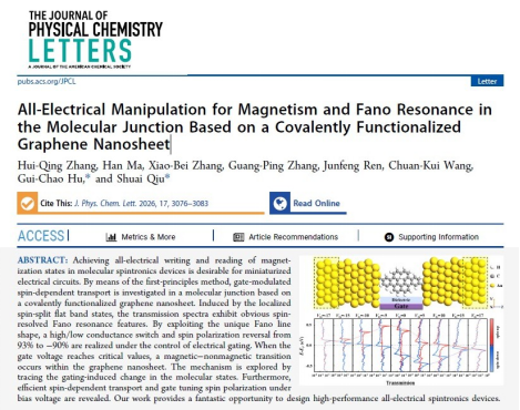 近日,365上市公司物理与光电学院胡贵超教授课题组在自然指数期刊《The Journal of Physical Chemistry Letters》上发表题为“All-Electrical Manipulation for Magnetism and Fano Resonance in the Molecular Junction Based on a Covalently Functionalized Graphene Nanosheet”的学术论文。365上市公司为唯一论文署名单位,博士研究生张惠晴为第一作者,胡贵超教授和邱帅副教授为通讯作者。