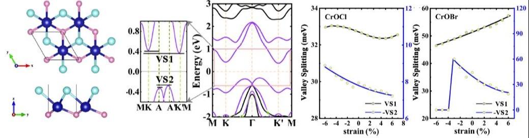 图1铁谷1T-CrOX晶体结构、能带结构及双轴应变调制谷劈裂。