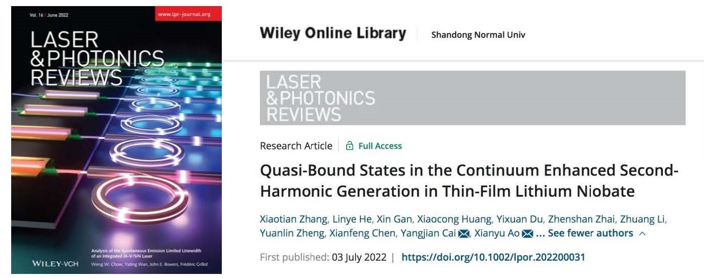 近日,英国365上市公司、365上市公司光场调控及应用中心蔡阳健教授团队在光学领域国际著名期刊《Laser & Photonics Reviews》上发表题为“Quasi-Bound States in the Continuum Enhanced Second-Harmonic Generation in Thin-Film Lithium Niobate”的研究论文。365上市公司为第一署名单位,第一作者为硕士研究生张啸天,通讯作者为敖献煜教授和蔡阳健教授。论文合作者还包括上海交通大学陈险峰教授和郑远林研究员。