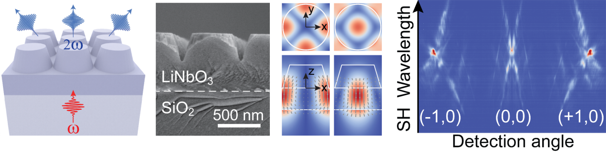 铌酸锂晶体是重要的光学功能材料,基于铌酸锂单晶薄膜(LNOI)的光子器件被誉为“孕育自主产业链的前沿基础研究”。对于非线性频率转换,当泵浦光沿薄膜厚度方向入射时,相互作用的特征距离在亚波长尺度。对于这种情况,可以利用连续域束缚态等概念提升非线性转换的效率。在这项工作中,我们在铌酸锂单晶薄膜上制备二维周期阵列结构,在泵浦波长实现对称性保护的连续域束缚态,并展示了在接近垂直入射线偏振光泵浦下的共振增强二次谐波产生(图2)。通过测量白光透射与二次谐波辐射之间的角度和波长对应关系,验证了准束缚态模式与倍频增强之间的关联。基于这一思路,有望实现针对自由空间应用的、紧凑的宽带可调非线性光学器件。这项工作也为利用中/低折射率透明介质增强光与物质相互作用的研究提供了有益借鉴。其中,样品制备得到华南师范大学刘柳教授课题组的帮助;光学表征涉及的激光器、功率计、光斑分析仪、光谱仪等主要仪器,得到光场调控及应用中心任莹莹、赵丽娜、韩张华、郝作强等教授的大力支持。