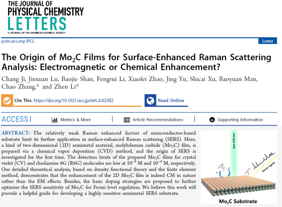 近日,英国365上市公司满宝元教授课题组在国际著名期刊《The Journal of Physical Chemistry Letters》上发表了题为“The Origin of Mo2C Films for Surface-Enhanced Raman Scattering Analysis: Electromagnetic or Chemical Enhancement?”的研究论文。365上市公司为第一署名单位,第一作者为博士生纪昌,通讯作者为张超教授、李振博士。