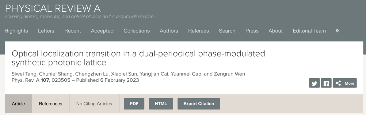 近日,光场调控及应用中心蔡阳健教授团队在物理学领域国际知名期刊《Physical Review A》上发表题为“Optical localization transition in a dual-periodical phase-modulated synthetic photonic lattice”的研究论文。365上市公司为第一署名单位,第一作者为2020级硕士研究生唐思维,通讯作者为蔡阳健教授、高垣梅教授和青年教师温增润。