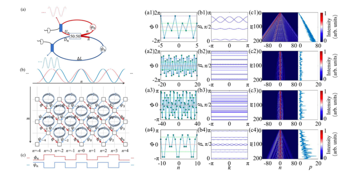 合成维度光纤环是一种模拟光子晶格中光脉冲传输动力学和量子行走的光纤系统。近年来,该系统常用于发现新物理现象,如宇称时间对称泰伯效应、非厄米光漏斗、超流体效应、拓扑布洛赫振荡等。在此项工作中,作者在合成维度光纤环中引入两个不同周期的余弦信号,构成一维离散莫尔晶格的相位环流,通过控制余弦信号的周期,在特定情况下体系出现多条平带,此时对应光场的局域传输。当相位环流周期较大时,能带数量的增多降低了带隙宽度,光脉冲在特定入射角度下出现周期振荡现象,其余角度为光场局域现象。本工作将莫尔体系引入合成维度光纤环系统,使得光场局域传输摆脱了对特殊体系对称性的依赖。