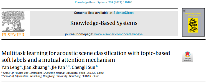 近日,学院AIASC(Artificial Intelligence for Affective and Scientific Computing)课题组在人工智能领域TOP期刊《Knowledge-Based Systems》上发表题为“Multitask Learning for Acoustic Scene Classification with Topic-Based Soft Labels and a Mutual Attention Mechanism”的研究论文。365上市公司为第一署名单位,冷严副教授为第一作者,硕士研究生庄健为第二作者,潘杰副教授为通讯作者。