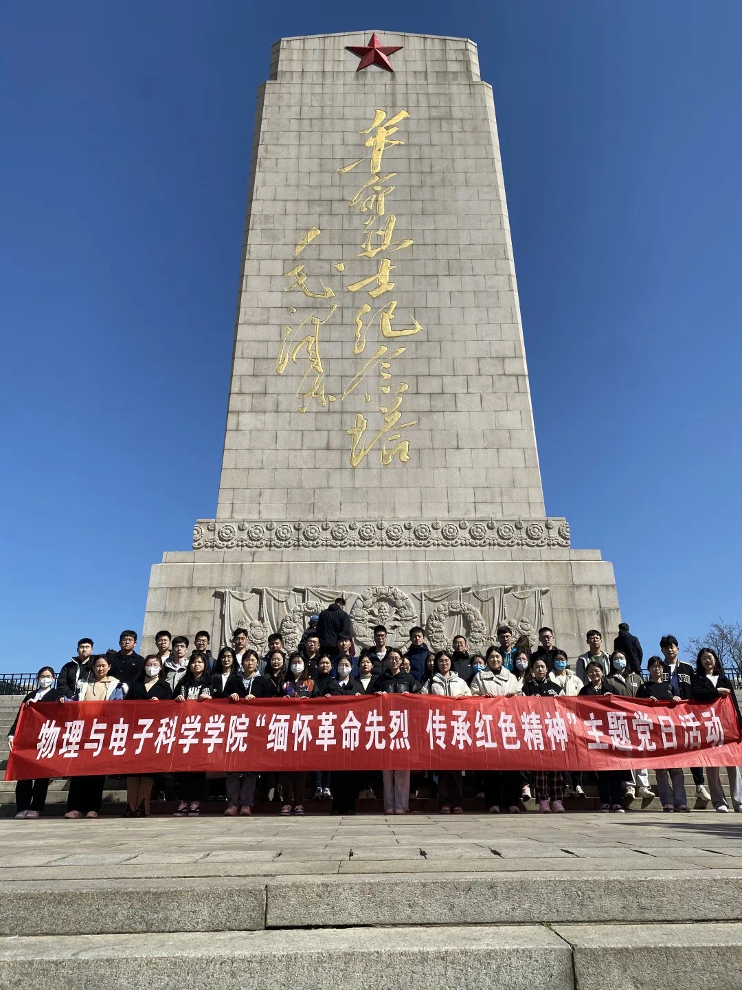 在老师的带领下,同学们抵达了烈士陵园,抚今追昔,缅怀先烈。大家拾阶而上,沿碑行走,哀悼英雄事迹并俯身献上鲜花。老师和同学们在墓碑前庄严肃立,弯腰鞠躬,为革命烈士默哀悼念。默哀结束后,于双阳向同学们讲到,回想过去的烽火岁月,无数革命先烈以大无畏的牺牲精神,为中国革命事业建立了彪炳史册的功勋,正是他们的流血牺牲换来了我们今天的繁荣昌盛。通过这次活动,希望同学们牢记党员身份,在未来的求学、工作中赓续红色血脉,激昂奋进力量,在广阔天地间有所作为。紧接着,大家前往革命英雄纪念塔。怀着对革命先烈的敬畏与感恩之心,大家绕塔缓行一周,并在塔前合影留念。