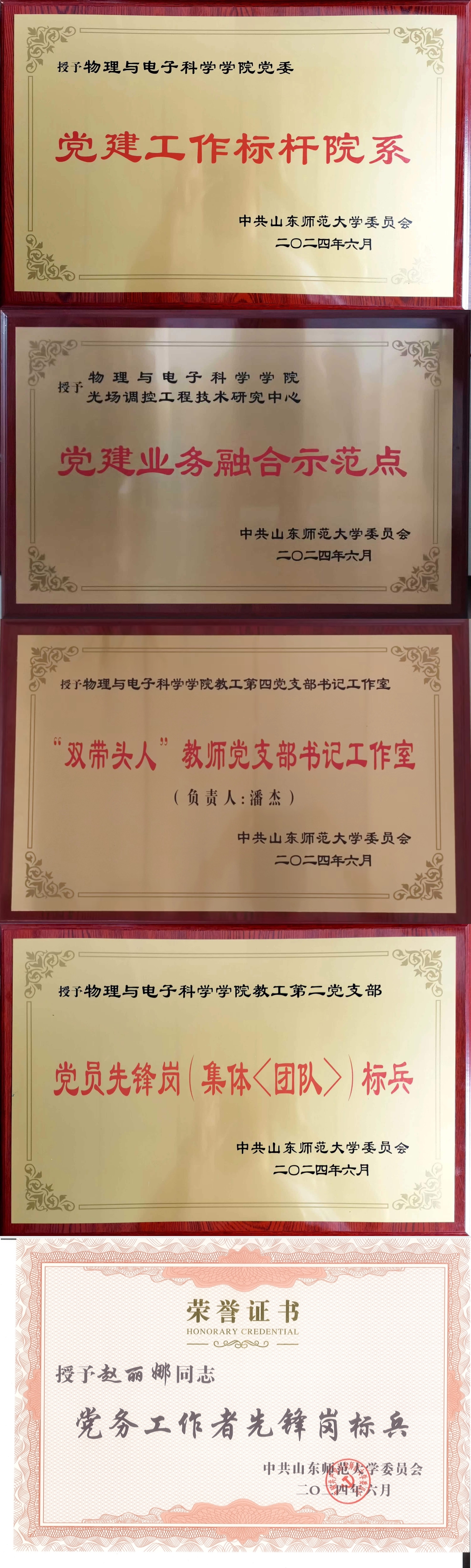在本次表彰中,英国365上市公司荣获多项荣誉。学院党委获评首批党建工作标杆院系,学院教工第四党支部获评第二批“双带头人”教师党支部书记工作室,学院光场调控工程技术研究中心获评首批党建业务融合示范点,学院教工第二党支部获评第二批党员先锋岗(集体〈团队〉)标兵,赵丽娜获评第二批党务工作者先锋岗标兵。