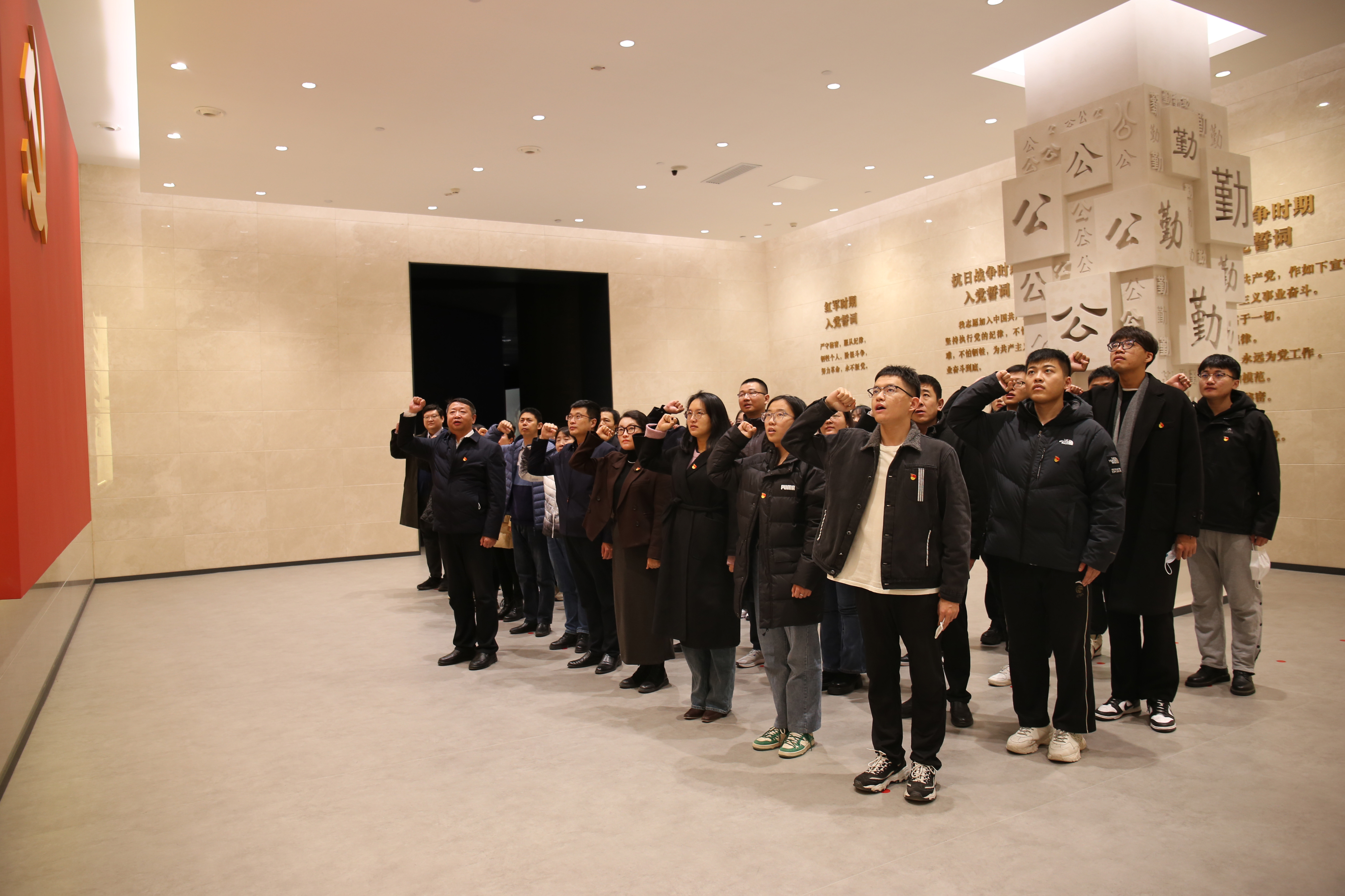 在教育馆宣誓厅,学院党委书记谢德仁带领全体党员面对鲜红的党旗,重温入党誓词并庄严宣誓,牢记共产党员的初心使命,坚定为共产主义事业奋斗终身的信念。最后全体党员集中观看了警示教育片,以案为鉴,警钟长鸣。