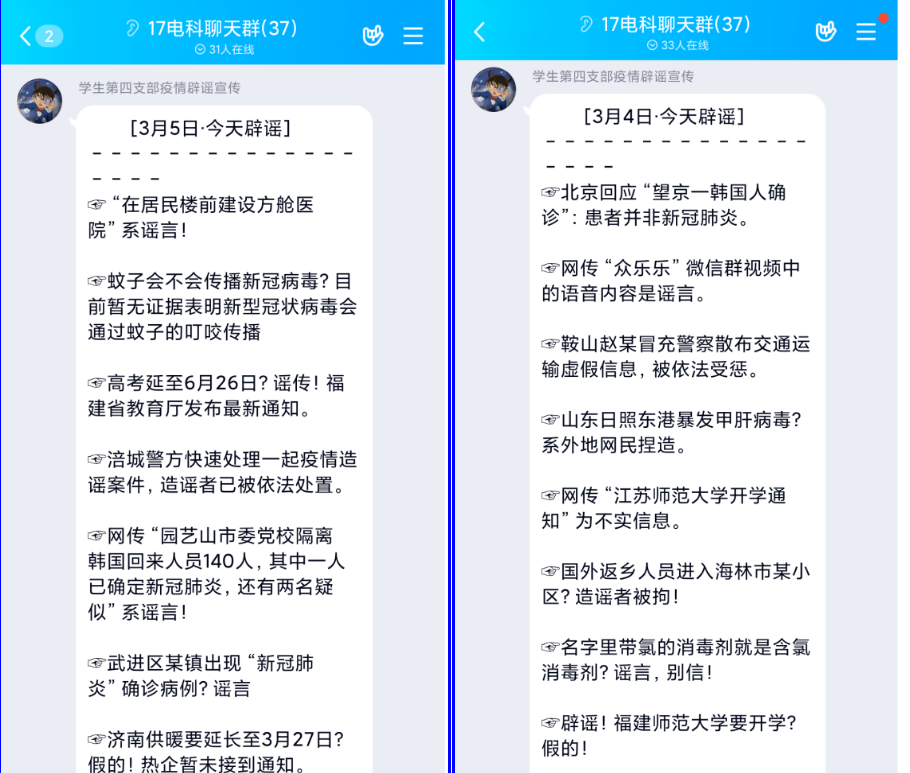 各党支部利用学习强国、灯塔系统、QQ群等网络平台开展理论学习活动,以适当方式开展线上“三会一课”,集中学习习近平总书记关于新冠肺炎疫情防控的重要讲话精神,为打赢疫情防控阻击战坚定信心。学生第一支部组织开展“提升党性修养,坚定必胜信念”主题活动,34名党员学习撰写学习心得体会,明确疫情防控重要性和紧迫性,提高自身思想认识。学生第七支部线上开展“同战疫,有我们”主题党课,分享疫情防控中共产党人的典型事例,展现共产党员的责任担当,激励支部党员为疫情防控做出自己的贡献。学习活动还吸收了部分入党积极分子参加,注重特殊时期的教育培养,引领他们以实际行动为疫情防控工作做出贡献。