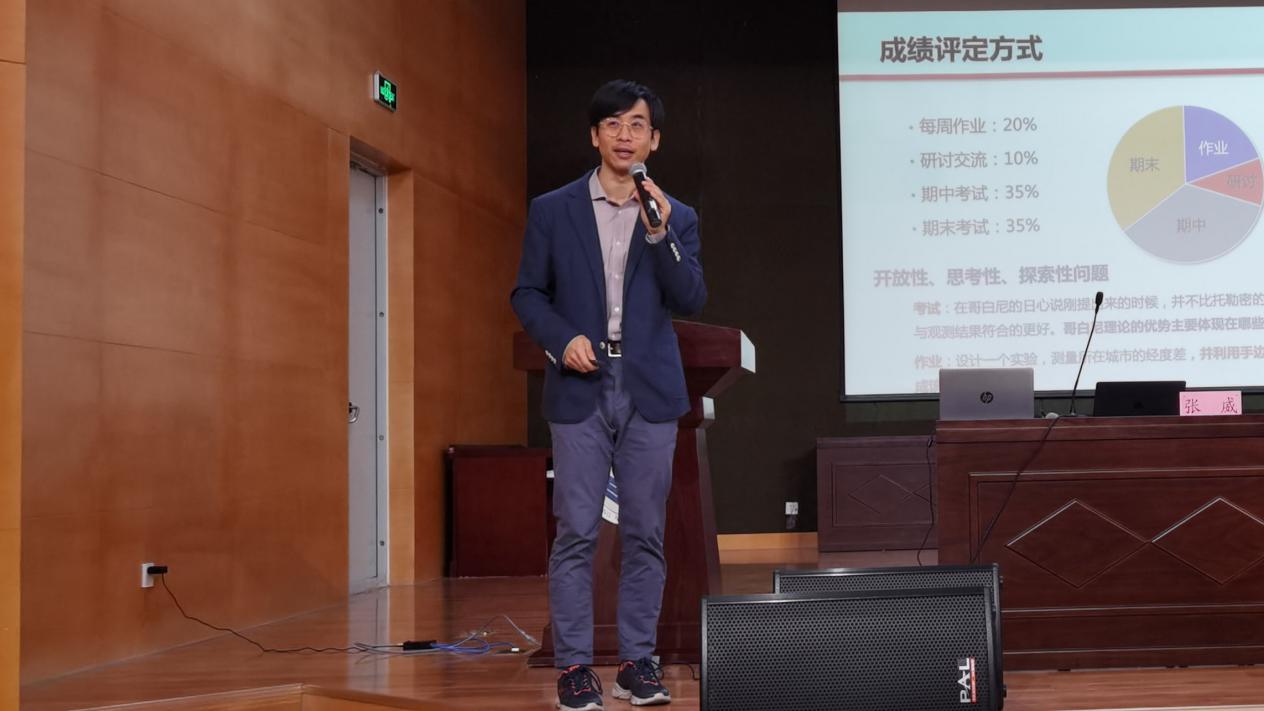 张威以幽默风趣的自我介绍开场,他认为,课程思政建设是物理教学过程中必不可少的部分,物理学课程思政的灵魂是“实事求是”,并呼吁在座的师生要先练好教学基本功。张威表示,传统教学体系重知识、轻方法,重结果、轻过程,因此通识教育需要进行“供给侧结构性改革”。在进行理论讲授时要注重推动教学与研究相结合,并对教学效果进行定量化质量评价。课程思政与金课建设要注重合二为一, 围绕课程凝练核心价值,遴选教学内容形成课程体系,组织教研团队创新教学方法,达到重根、求理、力行、有我。他总结到,物理教学与思政教育应相得益彰,知识获得与人格养成也是相辅相成、相互促进的。通过分层次、分类别挖掘课程思政元素,我们能够使课程思政更加自然、亲切,从而激发学生内在的思想升华、学习动力和创新潜质。