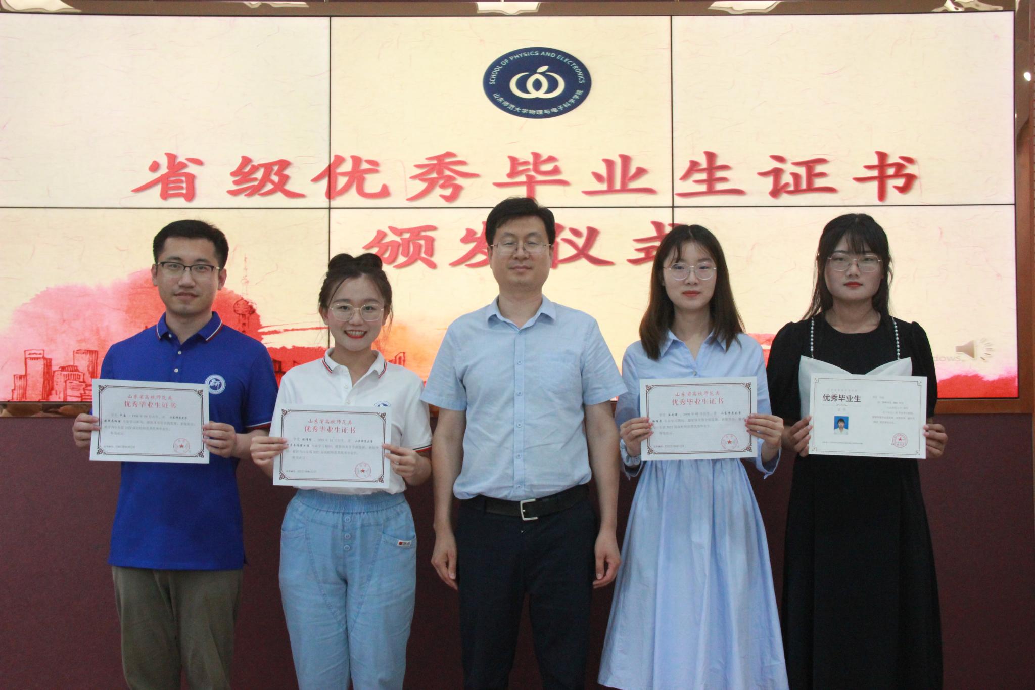 杜伟以习近平总书记给抗疫工作人员的回信引入主题,倡议本科毕业生无论是继续深造或是直接进入就业岗位,都要在党和人民最需要的地方绽放青春之光。他通过播放2022届毕业班各班班级风采展示视频,带同学们回忆大学四年青春时光。任俊峰、王书运、胡贵超、高守宝分别为省级优秀毕业生、校友联络员颁发证书,为毕业生代表颁发纪念品并合影留念。随后,毕业班同学将学习资料无偿捐赠给学院低年级同学,勉励低年级学生努力学习,在未来的日子为学院增光添彩。2019级物理三班的陈思颖作为在校生代表向毕业生表达诚挚的祝福,祝愿毕业生在未来的工作生活中,扬帆远航。在时光胶囊环节中,毕业生将自己对未来的畅想放入时光胶囊中,在刘杰、孟庆田的见证下,将时光胶囊交给毕业班辅导员,并约定五年之后一起打开,回顾此时的梦想与初心。本科毕业生代表甄雪阳、研究生毕业生代表周长达上台发言,他们回顾了各自的学习经历,表达了对母校的感恩,并表示在毕业后将学到的知识应用到社会建设中,不辜负学校的苦心栽培。在交流环节,毕业生们回忆起山师的美好时光,纷纷表达对老师们谆谆教诲与学院栽培的感谢。刘杰和孟庆田对毕业学子提出不忘初心牢记使命、摆正心态虚心学习、回馈社会等几点要求,希望同学在毕业后依旧努力拼搏,成为国家的栋梁之才。