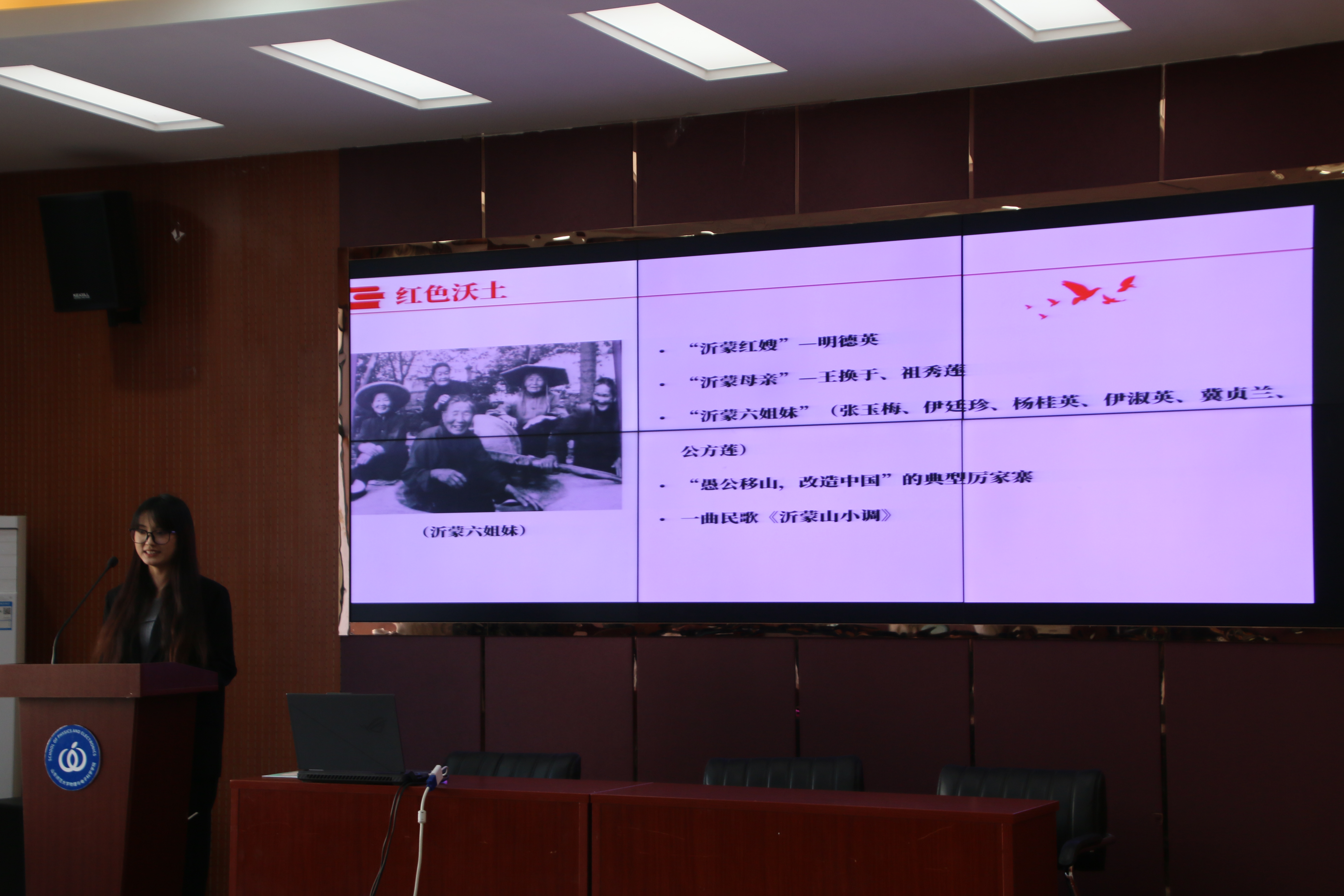钱玲玲从沂蒙精神的价值、沂蒙精神的历史见证、沂蒙精神在当代大学生中的传承与发扬、沂蒙精神对改革开放以来创新发展的深远意义四个方面进行讲解。期间,她谈到沂蒙六姐妹、“用党心换民心”的山东省政府首任主席黎玉、孟良崮战役中用身体搭建的“人桥”的沂蒙妇女等感人事迹。她将沂蒙人民在革命战争时期无私奉献、爱党爱军的热血岁月生动展现在同学们面前。她强调,沂蒙精神不仅仅局限在过去的岁月里,无论是战争年代、社会主义革命和建设时期还是改革开放新时期,沂蒙精神都能随时代一起脉动,不断汇入新的时代内涵,具有强大的生命力。她希望,广大青年学生能以沂蒙精神为灯塔,照亮前行的道路,为实现中华民族伟大复兴的中国梦贡献自己的智慧和力量。