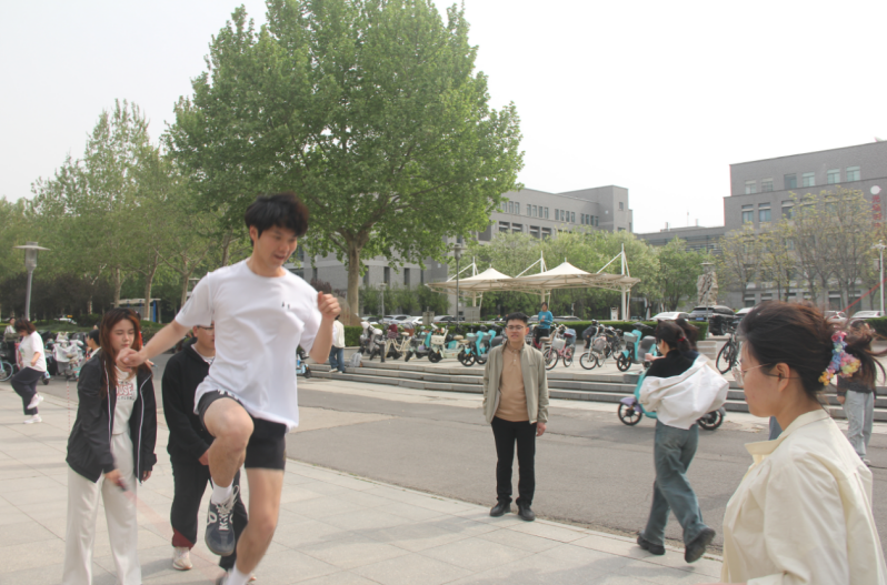 阳光乐跑打破传统的跑步模式,活动融入小游戏的形式,更具趣味性。摸石头过河环节中,同学们需踩着泡沫砖灵活移动,稍有不慎便“落水”重来;绑腿跳房子环节,两人一组绑腿协作,以“兔子跳”等创意方式竞速;你画我猜环节欢笑不断,比划者用肢体演绎词汇;寄语墙前,学生用彩笔书写祝福,并绘制卡通图案留念。这不仅是平衡感和身体协调性的考验,更是对团队协作能力的极大挑战。通过趣味乐跑,激发了同学们的运动热情,提升了肢体协调性和团队合作能力,使同学们在春日暖阳中留下活力身影。