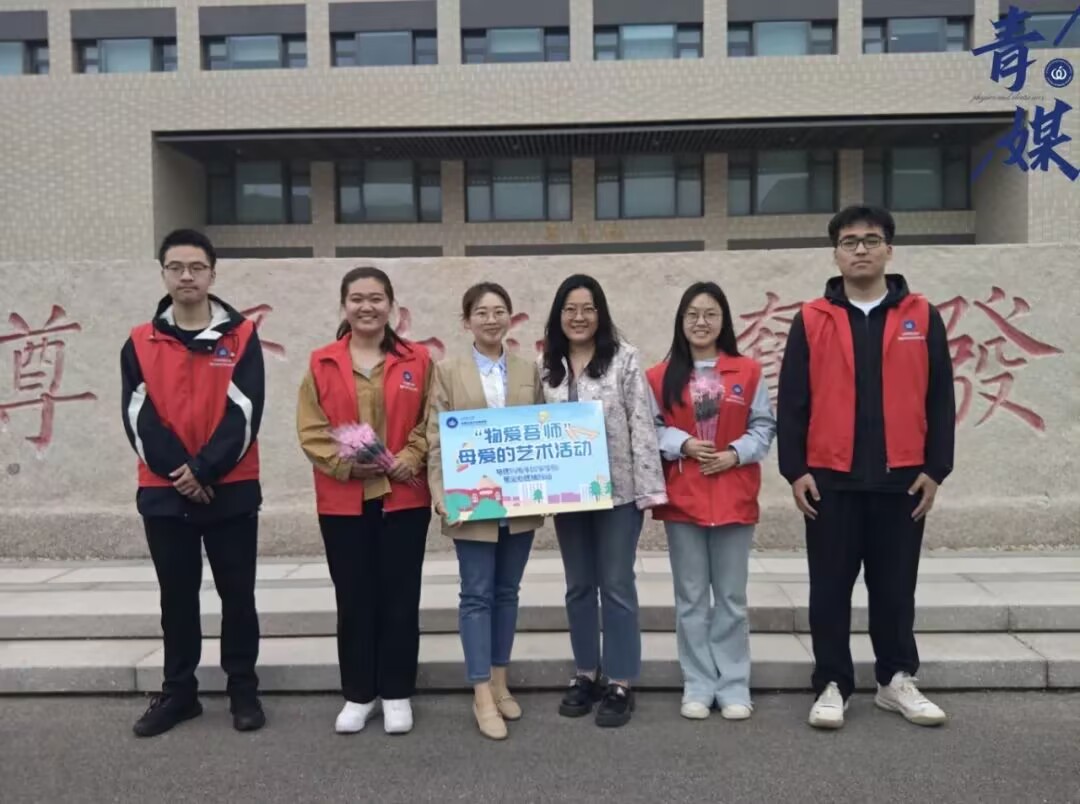 志愿者们身着马甲,为上课的女老师送上酸奶、香蕉与鲜花,传递着对老师们的浓浓敬意与关怀。