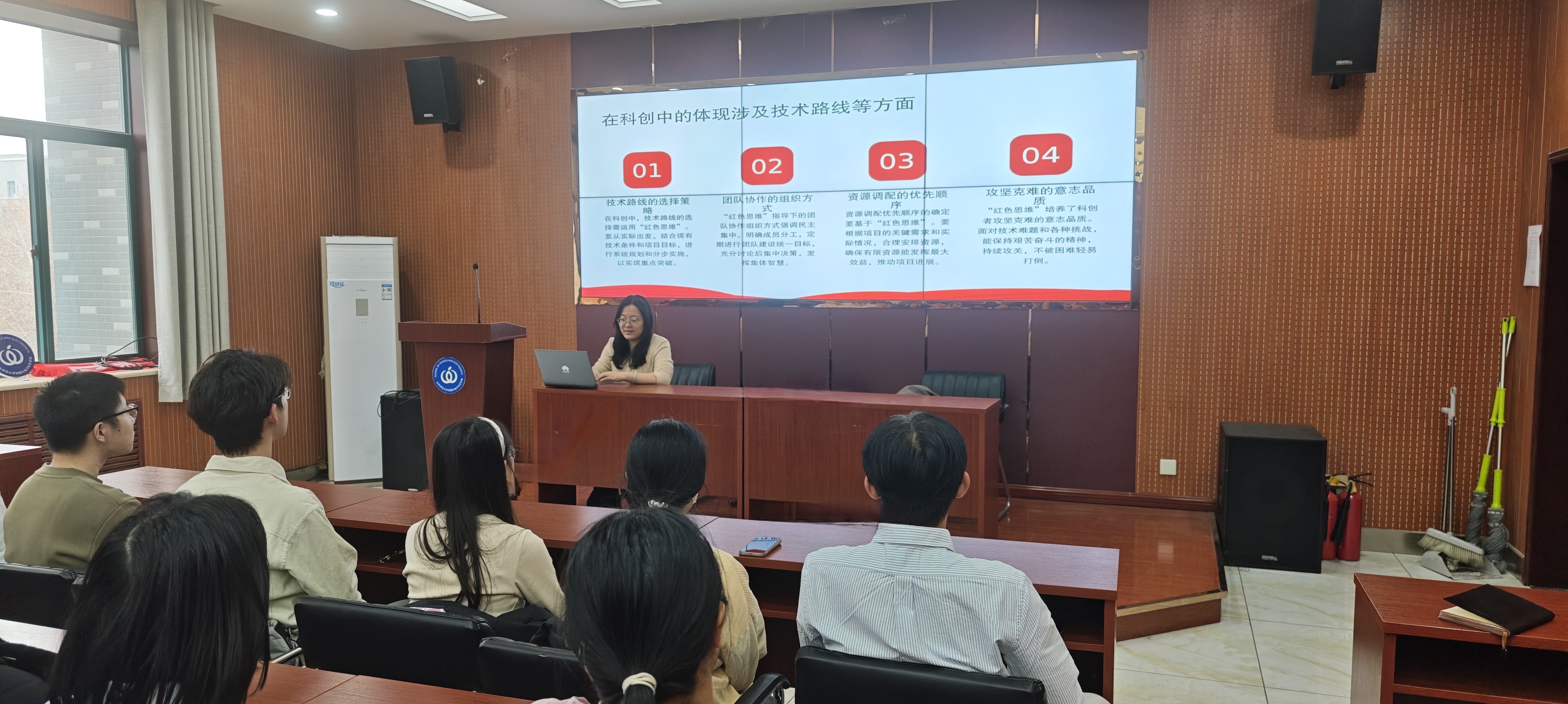 课程重点讲解了“问题导向”工作法,通过“两弹一星”工程、红旗渠建设、改革开放初期技术引进等党史中的经典科技攻关案例,生动展现了党在解决重大技术难题中蕴含的智慧。尹素月进一步提出了科创实践“问题导向四步法”——发现真问题、分析问题本质、设计解决方案、评估与迭代,为青年学生提供了具体可操作的方法工具。