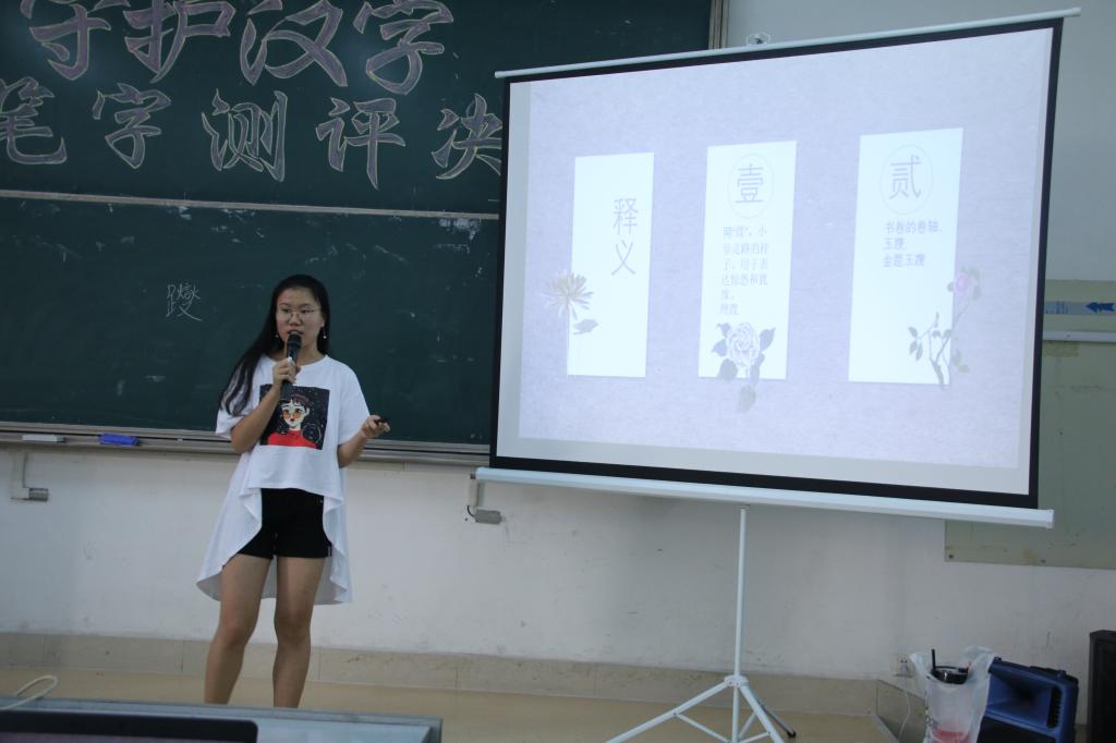活动伊始,由“以你之名,守护汉字”视频开场,向观众展现了汉字消亡的危机感,带领大家进入汉字的世界。经主持人的精彩介绍,10位选手按照顺序上场,怀着对汉字的崇高敬意介绍自己所守护的汉字,以生动地语言将该汉字的来历,演变过程以及相关的典故娓娓道来。来自2016级卓越物理班的戚馨就汉字“乂”为大家带来了详细而生动的介绍,看似熟悉却又陌生的字引得台下观众频频感叹,“汉字的博大精深值得我们细细品味”。10位选手精彩的讲述过后,第一环节“以你之名,守护汉字”告一段落。第二环节“诗中有谜,谜中有诗”正式开始,伴着轻柔缓和的音乐,选手依次上台写下自己最喜爱的诗歌与观众、评委分享。选手书写诗歌期间穿插有趣的字谜与现场观众互动,台下观众跃跃欲试,现场氛围高涨。第三环节由物电学院宣传部干事靳智淯带来“我与汉字的故事”,为大家分享写好软笔书法的经验。活动最后,2016级卓越物理班戚馨摘得桂冠,2017级电子信息工程二班张梅婷等4人获得二等奖,2017级物理六班杨丽莹等5人获得三等奖。