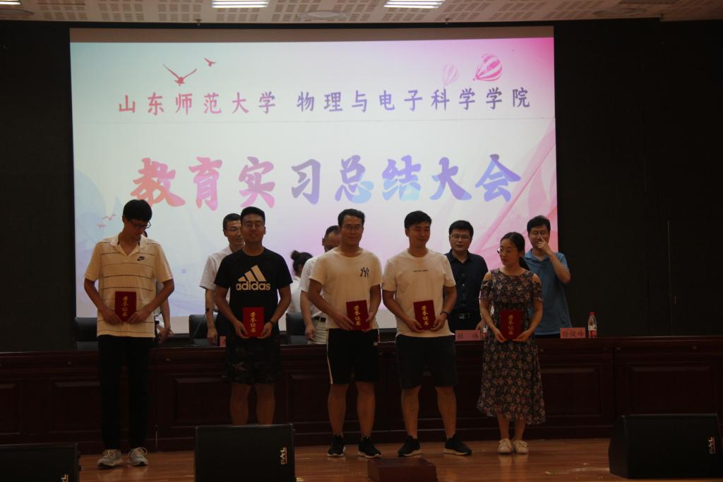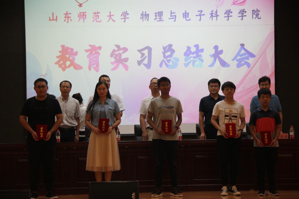 本次报告会在一段回顾实习生活的短片中拉开帷幕,随后来自2016级物理一班的魏韵佳进行了题为《库仑定律》的模拟授课展示,两个环节的进行带领同学们再次回顾了实习生活。会上,杜伟首先宣读了院级优秀讲课先进个人、校级优秀教育研究报告、校级优秀教育实习学生的表彰名单并由学院领导为优秀实习生代表进行颁奖。紧接着,蔡阳健就感谢、收获、反思三个方面表达了自己对本次实习的几点看法,他表示,正是在实习学校、学院、实习学生三方的共同努力下才圆满完成了本次实习工作,大家在实践中发现所长与所短,学院也在实践中发现教学过程中的得与失,从而可以更好地调整教学计划,使明年的实习工作更具成效。随后,赵曰峰就实习工作进行总结发言,再次表达了对学院各位指导教师的感谢以及对各位实习生的期待和要求。会议最后,为让学生们找准发展目标,合理安排学习生活,宋玉志就考研问题与大家进行了相关分享,并就本学院物理学硕士专业在科研发展、资金支持、师资力量等六个方面向大家进行了介绍,以增进大家对考研的相关认识和了解。
