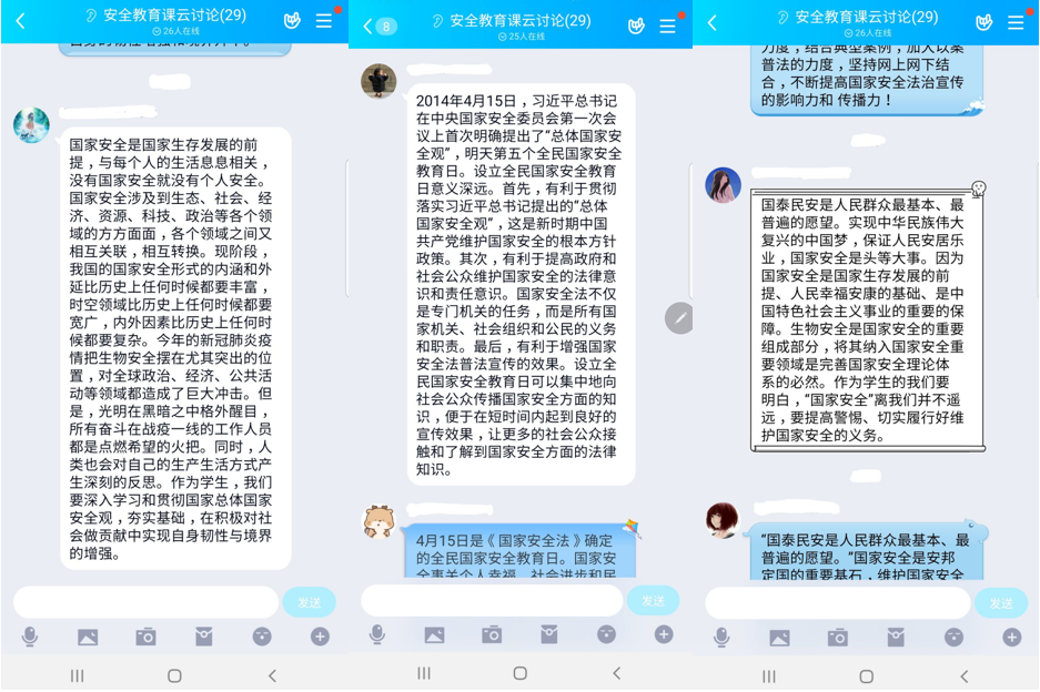 本次课程分为两大部分,第一部分由范维澄教授介绍我国国家总体的安全体系、传统安全与非传统安全的种类以及对新形势下国家安全风险进行举例,让同学们更加全面深入的了解国家面临的挑战。在第二部分,范维澄教授对生物安全的概念和疫情之下的国内国际形式进行了详细论述,介绍生物安全所涉及的领域及其关注焦点,同时又以详细的数据说明疫情对国际经济的冲击以及对中国经济增长的影响,明确指出这场疫情之中也是既有挑战也有机遇,作为大学生应提高安全意识,珍惜假期时间,为维护国家安全做出贡献。在观看结束后,各年级通过QQ班级群在线讨论、撰写直播观后感的方式,表达对疫情的认识和国家安全形势的理解与看法。通过观看节目,同学们认识到国家安全是国家发展最重要的基石、人民福祉最根本的保障。国家安全是青少年必备的知识、必备的素质。17级本科生周菂说到,这场特殊时期的课堂让我认识到安全的重要性和严峻性。自己要从力所能及的小事做起,丰富国家安全知识,提升自己判断和辨别能力,自觉维护国家安全。18级研究生李治兵提到,作为新时代的大学生,我们应始终树立国家利益高于一切的理念,打好热爱国家安全防御知识、献身国家安全防御知识的思想基础,树立责任意识和忧患意识,肩负起建设和保卫祖国的重任,为中华民族能立于世界民族之林而努力奋斗!