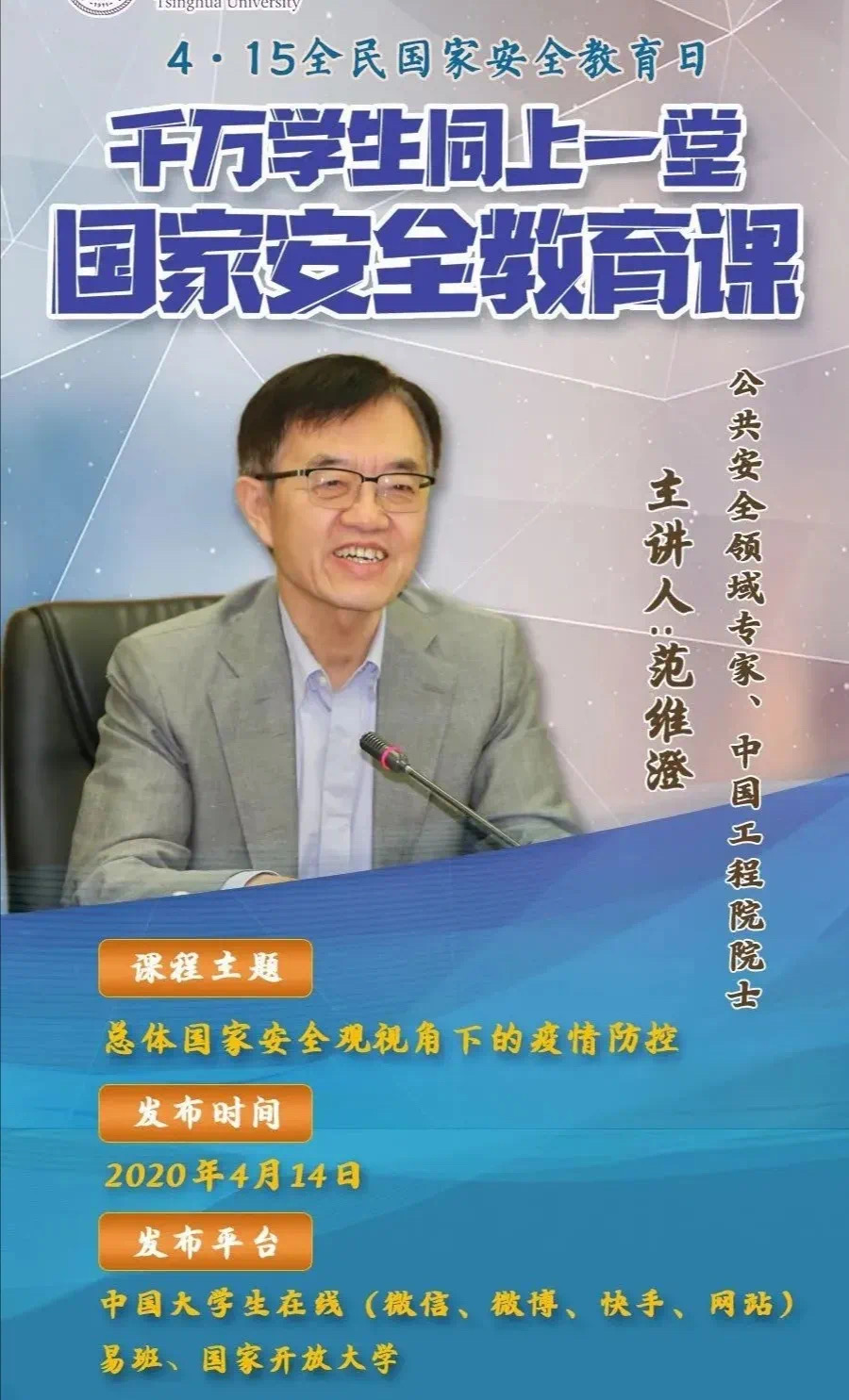 2020年4月14日上午10:00,教育部推出《千万学生同上一堂安全教育课》活动,本次活动以总体国家安全观视角下的疫情防控为主题,由公共安全领域专家、中国工程院院士范维澄教授主讲。英国365上市公司组织全体本科生和研究生认真观看,明确我国总体国家安全体系和疫情形势下对大学生建设和维护国家安全体系的要求。
