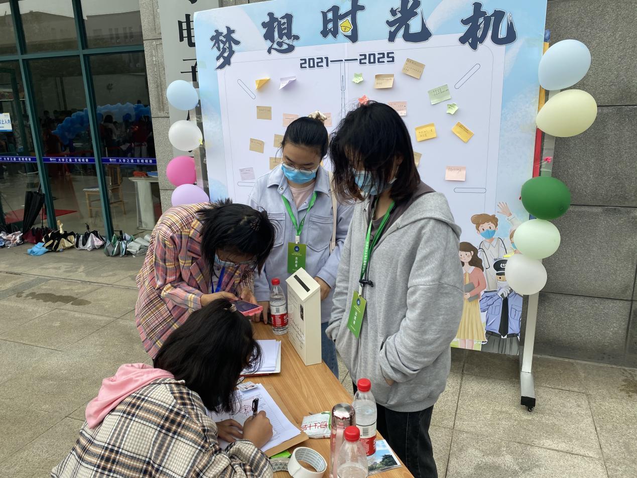 迎新现场,志愿者分布于各个接待点,为同学们提供便捷高效暖心的迎新服务,新生在志愿者的帮助下,完成办理入学手续、搬运行李、抵达宿舍等“一条龙”服务,使整个入学过程变得安排周密,规范有序。迎新过程中,学院为新生准备了多项暖心活动。9月3号,学院为每一位省外学生准备了一份新生礼包,让他们感受到家一般的温暖。9月5号,学院给第100名报道新生赠送文创套装,为9.3、9.4、9.5日过生日的同学分发小蛋糕及小礼物。2021级新生白玛卓嘎来自西藏,9月5号报道日恰好是她的生日,学院特别为她准备了“生日启航的你”庆生仪式。更令人惊喜的事,曾庆良校长在报到当天也来到了现场,亲手将蛋糕送给白玛卓嘎,与她进行了亲切交流,并勉励她好好学习,报效家乡。新生在报道完成后,在志愿者的引领下,参观了学院特设的“科创成果展”,由讲解员带领下初识竞赛,了解竞赛相关知识及我院获得的成果,让科创的种子在新生心中萌芽。在家长接待处附近,学院特别筹划的“梦想时光机”活动受到了家长和学生的一致好评,他们纷纷留言写信,许下大学四年的期盼。整个迎新过程井然有序,志愿者们热情的服务和高效的工作得到了家长和新生的一致好评。