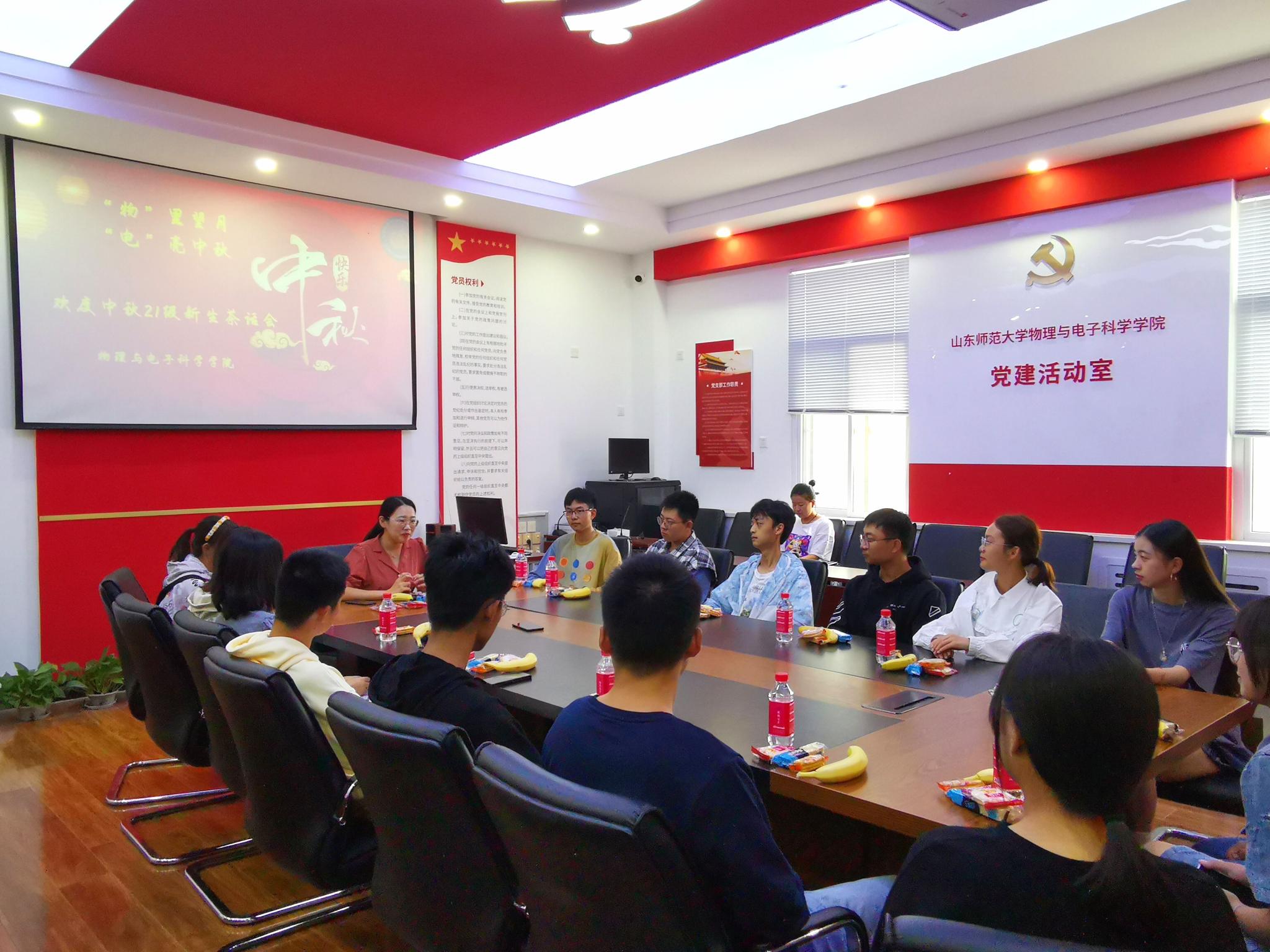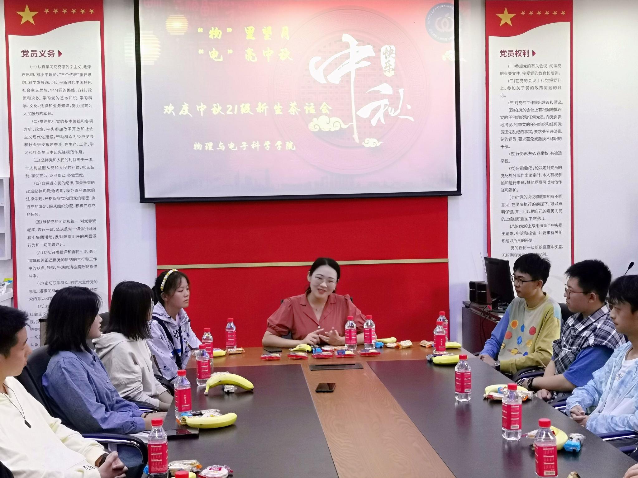 活动伊始,姚方圆欢迎来自五湖四海的同学们来到365上市公司,她谈到,省外新生由于离家较远不能回家与亲人团聚,这是在济南的第一个中秋节,但是物电学院就是我们温暖的家。本次活动初心是代表物电学院为大家送温暖,送祝福。其中特别的“‘物’里望月,‘电’亮中秋”定制月饼满载着对同学们的关怀关心与祝福。姚方圆勉励同学们,不仅要学习专业知识,扎实肯干,更要做一个有担当、有理想的年轻人,怀揣一颗“强国有我”信念的中国心。随后,同学们围绕着自己家乡节日风俗与人文自然进行分享交流,各抒己见、畅所欲言。2021级电子信息类一班的佘诚谊感谢学院从开学核酸检测送食物包,从军训再到过中秋对自身关心关怀经历,表示会不断努力学习,积极进取,争做有理想有担当的新一代中国青年。来自河北承德的申灿表示来到山东,明显感受到山东人的热情豪放,无论大街小巷都充满着热情洋溢,并且十分喜欢济南大明湖和趵突泉等风景区的泉文化,“四面荷花三面柳,一城山色半城湖”的评价属实当之无愧。活动最后,姚方圆祝福同学们度过一个温暖涌动,舒心舒适,欢快愉悦的中秋节!